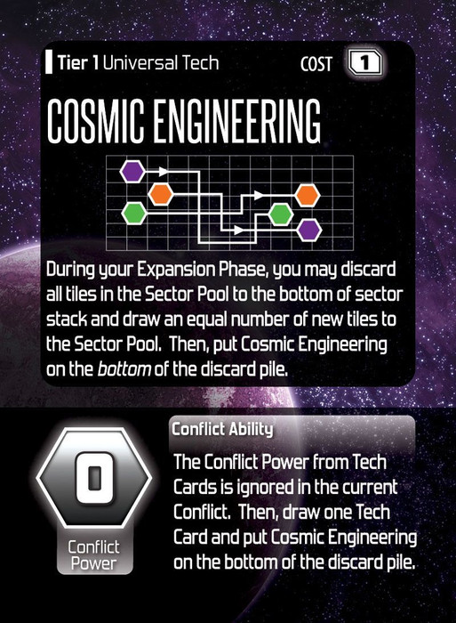 Once advanced, this card provides a one-use technology that allows you to discard all the tiles in the sector pool and refill the pool with new tiles from the stack. When used in conflicts, Cosmic Engineering results in the power from played technology being ignored, but the card must be discarded after use.