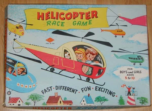 This game by Warren Paper Products Company was released sometime in the 50's and was capitalizing on children's fascination with a relatively new mode of transportation - the helicopter. The players race along a track spanning a map of the US, starting in California, hitting the Atlantic seaboard, and then racing back to California for the exciting finish.
