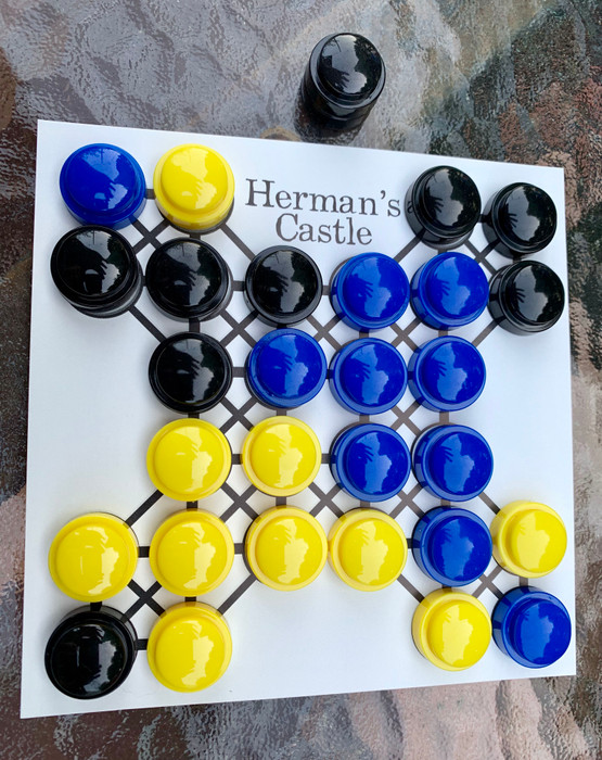 The board consists of an X-shaped grid representing the castle. Owners of the game supply their own colored stones (10 red, 10 blue, 10 yellow). On a player's turn he places a stone of any available color on any empty space in the castle. The player immediately scores points for placing stones of the same color next to each other.