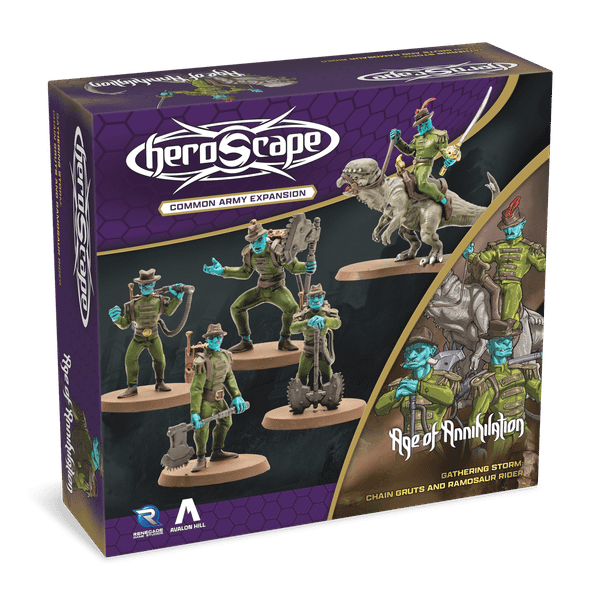 This expansion includes one 4-figure Common Squad and a Common Hero. The highly detailed, pre-assembled miniatures and 2 Army Cards are fully compatible with all Heroscape Battle Boxes, Master Sets, and Expansions. Get ready to charge onto the battlefield with the Ramosaur Rider, smashing enemy lines with devastating speed, and the Chain Gruts fighting in perfect coordination with their champions.