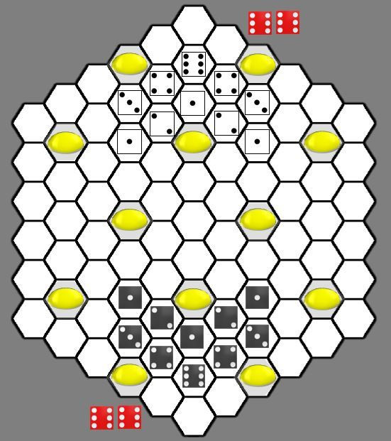Turns: Players alternate turns, either moving/attacking with a Bee (a die) or adding a Reinforcement Bee.