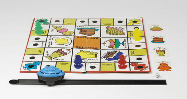 This is a talking children's boardgame. This is a roll-and-move game with cards. The theme of the game is eating.