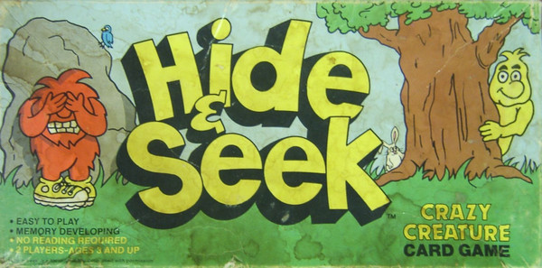 An interactive children's memory game. Taking turns each player tries to find a matching 'Crazy Creature' which matches the Hide and Seek card. If a player successfully finds a match they can move 'IT' one space closer to their opponents Gotcha circle. When 'IT' reaches either players Gotcha circle the other player is the winner.
