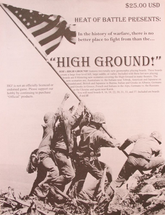HOB's High Ground! features two geomorphic playing boards and 8 new scenarios to be used as an expansion to the Advanced Squad Leader rules set. These boards create a large four-level hill, large saddle, or valley that allows players to experience the importance of gaining the high ground in World War II battles.
