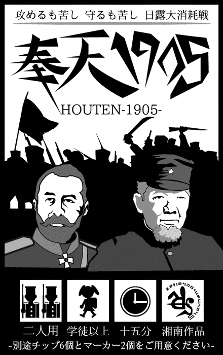 å¥å¤©1905 (HOUTEN 1905), the decisive Battle of Mukden during the Russo-Japanese war sets the stage for this head-to-head war card game. Players lead either the Japanese or Russian military in an attempt to fulfill one of a number of requirements for victory.