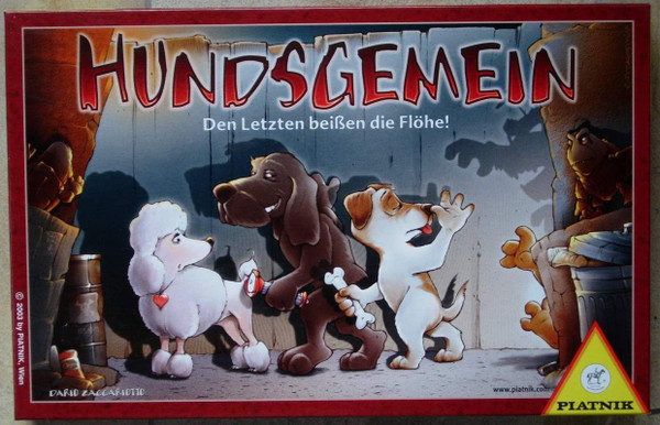 Players control gangs of nasty flees out to prey upon unsuspecting dogs that are wandering through a seedy section of the city. The fleas are placed on a 7z7 grid while the dogs wander the streets between the rows and columns. Fleas are placed picture-side (flea-side) up, with no identical fleas allowed on adjacent squares. After the grid is filled, the fleas are turned over, displaying the color of the player who placed them. The player with the most fleas on both sides of a street captures the unsuspecting dog on that street. Points for captured dogs are totaled, and the player with the most points wins.
