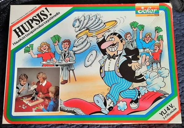 Hupsis is a dexterity game, where a card board waiter tries to keep his balance and not to drop any plates from his tray.