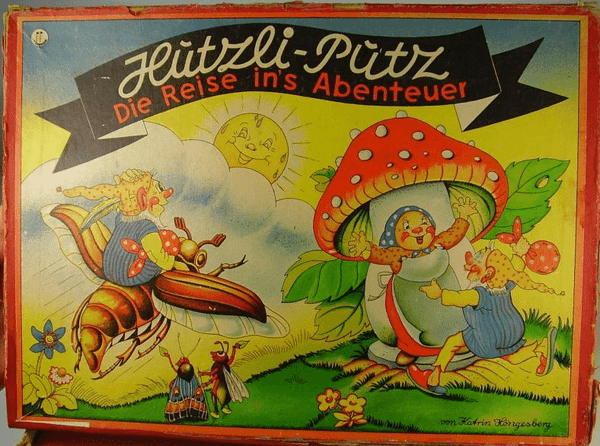 Each player moves forward according die roll; ending on a red marked space follow instructions glued into the lid.