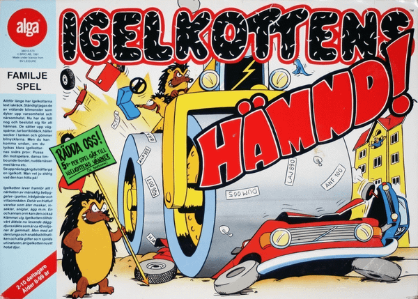 The Hedgehogs Revolt! Players have four cars and four hedgehogs, and one secret goal for each car. The objective of the game is to get all of your cars to their goals while using your hedgehogs to obstruct the other players' cars. When a hedgehog and a car ends up on the same space a card is drawn. The card asks for a certain type of insurance card. If the player can't provide said card, he has to act out a certain mission. The missions are something like "Imitate your favorite animal", "Walk backwards around the table", "Laugh for one full minute", or "Sing a song from the Eurovision Song Contest".