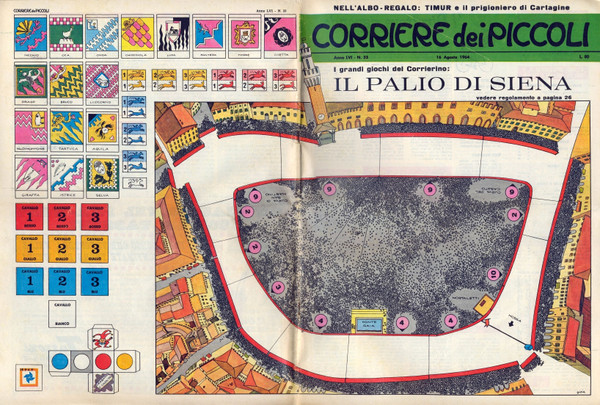Players representing horses from ten of Siena's 17 contrade run three laps of the track around Siena's Piazza del Campo. The game board has 12 squares, two of which are dangerous curves where riders risk falls that would force them to abandon the race. Each turn, players send their horses forward one, two, or three squares — but movement is restricted for some squares, reflecting the close quarters of the actual race course. When a horse lands on a square with other horses, a dice roll determines whether the moving horse gains a bonus movement equal to the number of horses on that square, or whether the horse's rider is thrown. Riderless horses continue to race, but with significantly reduced chances for winning.