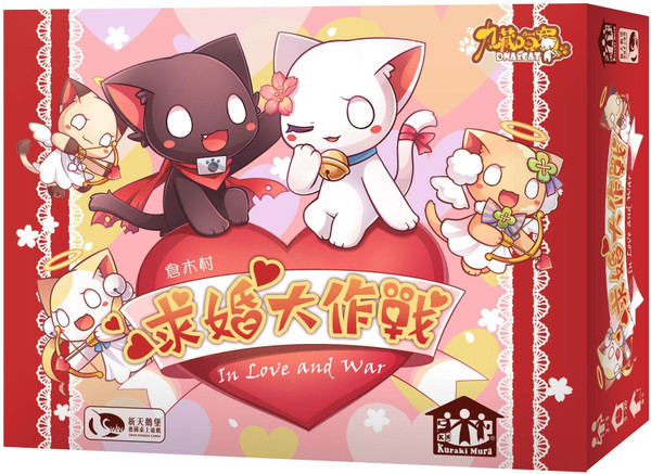 In Love and War is a rummy-style card game for 2-5 players. Each turn players draw a card and discard a card representing romantic acts, aiming to fill their hand with two sets of three and one pair. If another player discards a card that completes your set, you may interject "Meow!" to interrupt the normal turn order and steal it. When you finish all three sets, say "Meow Meow Meow!" to trigger a marriage proposal. Shuffle a special "Yes, I do" card into your hand and draw a card randomly. If you draw the "I do" card, you win! But other players with the same cards may add them to your shuffled hand to reduce your chance of success. If you fail, the game continues but you may take an extra "I do" card during your next proposal attempt.