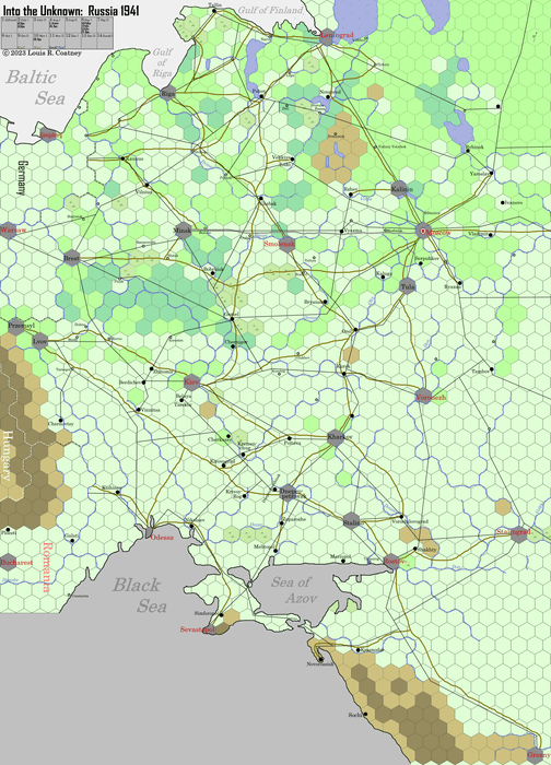 This is a kind of distillation of my previous hex-and-counter Barbarossa games, onto a standard US wargaming 22x34" mapboard.