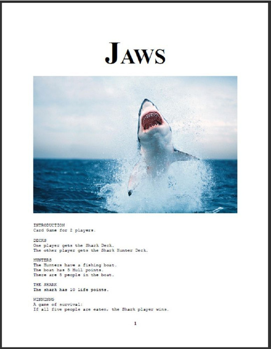 "Card Game for 2 players. One player gets the Shark Deck. The other player gets the Shark Hunter Deck. The Hunters have a fishing boat. The boat has 5 Hull points. There are 5 people in the boat. The shark has 10 life points."