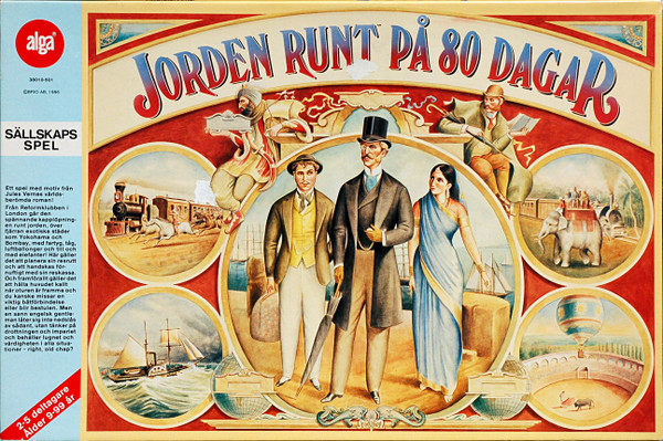Jorden runt på 80 dagar ("Around the World in 80 Days") is a game that simulates the Jules Verne book with the same name. This game was published by Alga and is not to be confused with other "Around the World" games with Verne connection. Especially not the Ravensburger edition Around the World in 80 Days that was published in the same year(!).