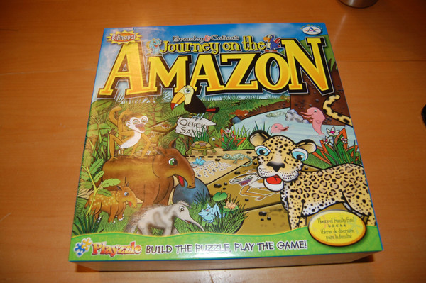 To play, first you have to construct the gameboard, which is basically a large, 12-piece floor jigsaw puzzle that measures 20" x 30" when put together. Once the board is constructed, it displays a winding path through the jungle or Amazon. Over a dozen animals specific to the region featured are included several times on the game spaces that make up the path. A deck of cards featuring the animals is included and players take turns drawing cards and moving to the animal shown. The first player to reach the end of the path, wins!