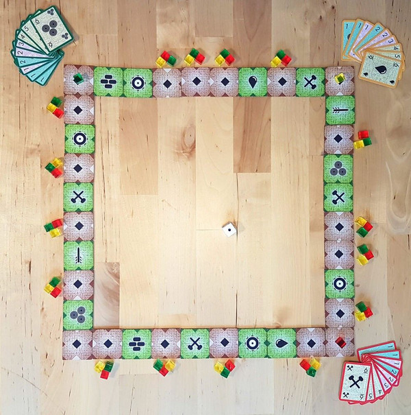 Jump Gate is a roll-and-move game where you race your spaceship around the track of tiles to collect your cargo crates. When ever you land on a jump gate you are teleported ahead to the next tile with the same symbol. Every player starts with a set of 9 cards in hand with identical numbers. Use each card once during the game to move forward or back after your regular movement. First player to collect all of their cargo is the winner.