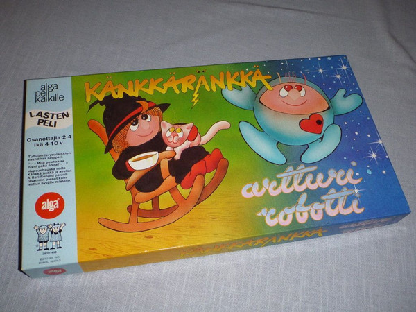 A very simple spin-and-move game for kids, teaching mainly colour recognition. Using the spinner you either move forward to the next colour that you spin; or if the spinner tells you to be Artturi the good Robot you move another player forward, and if it tells you to be Känkkäränkkä the evil witch, you move someone back. First one to finish wins.