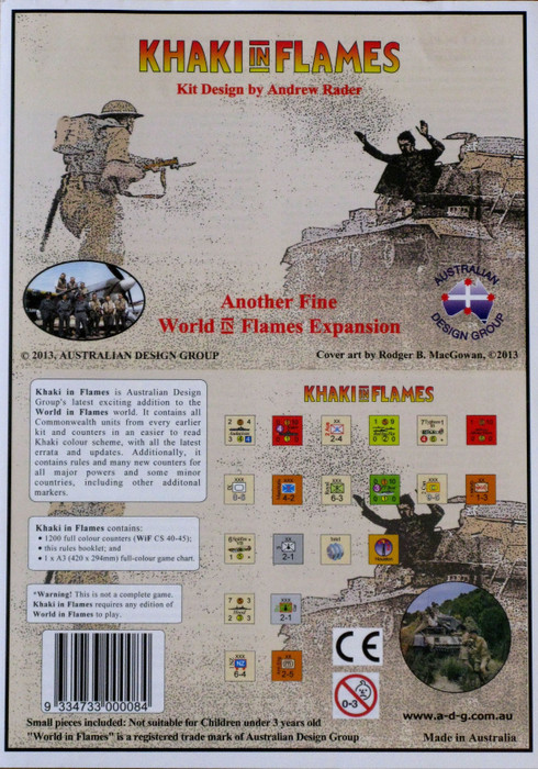 Khaki in Flames introduces a whole slew of new units to World in Flames, such as NKVD divisions, flak, coastal fortifications, shipyards, home guards, garrison divisions, border troops, the Red Sea Flotilla and more. Khaki in Flames also upgrades all Commonwealth units from WIF and all previous expansions on an easy-to-read khaki background, and gives players territorials and Chinese warlords in new colors for when these units "switch sides".