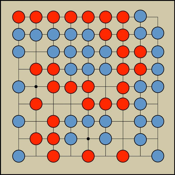 Starting with black, players alternate placing stones. A player must have at least 2 stones orthogonally adjacent to a space in order to control it. A player controls a space when he owns a majority of the stones orthogonally adjacent to the space. If the space is occupied by his opponent, the enemy stone is removed from play. If a space is surrounded by an equal number of stones of both colors, it is a legal placement for either player. It is forbidden for a player to place a stone on a space controlled by his opponent, even to make a capture. If a player has no legal move on his turn he must pass. Passing is otherwise not permitted.