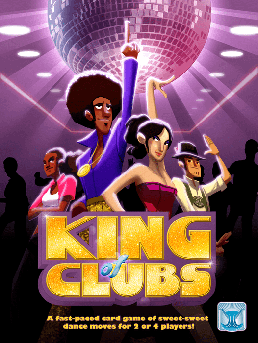 King of Clubs is a fast-paced card game of sweet-sweet dance moves for 2 or 4 players. In the basic two-player game, each player has a team of dancers valued 1-5. In each round, four of the nine nightclubs (valued 2-7) are revealed, with nightclubs of the same value being paired for a couple's dance. Each player assigns one dancer to each nightclub (two dancers for a couple's dance), then players reveal the values of the dancers with the highest-valued dancer(s) winning the prestige value of the nightclub; the back-up dancer held in hand breaks ties. Whoever wins the most prestige in the round earns a point, and the first player to win five points wins the game. In the four-player team version, each teammate sends a dancer to each nightclub (without consulting one another about who's being sent where), and the highest low-valued dancer in each nightclub wins the prestige; if the lower-valued dancers are tied, then the higher-valued dancers are compared.