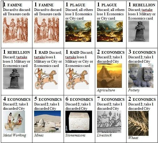 This is a Warpspawn card game. Each player strives to have founded the most successful Hittite Empire by time the 10th King card is played. Players draw and maintain hands of Power Cards - economics, religion, diplomacy, disasters, militaries, politics - each has a value which can be used to bid on Empire cards - kings & wars - which may allow you to also acquire cities, cultures, vassals, bronze. After the bidding phase comes an event phase when Power cards can be discarded to acquire Empire cards or cause others to discard cards. Periodically - at end of Old (4th King) Middle (7th King) New (10th and last King)Kingdoms - players get victory points for different types and amounts of Empire cards.