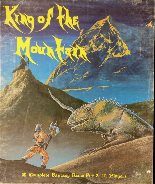 (From the introduction) King of the Mountain is a moderate skill-level strategy game for 2 to 10 players, Ages 8 and up. The object of the game is to be the first player to have his/her character reach the Citadel at the top of the mountain, which is the center hex of the game board. Players guide their character-counter from the board's edge, which is the base of the mountain, along paths and through tunnels in order to get to the peak. Attempting to stop the players is a malevolent Wizard, played by one of the players. The Wizard controls the different monsters on the mountain, causing them to seek out the characters and do battle with them. The object for the Wizard player is to see that no one reaches the Citadel. Depending on the number of players, the game should last between 45 minutes (two players)and 3 hours (10 players).