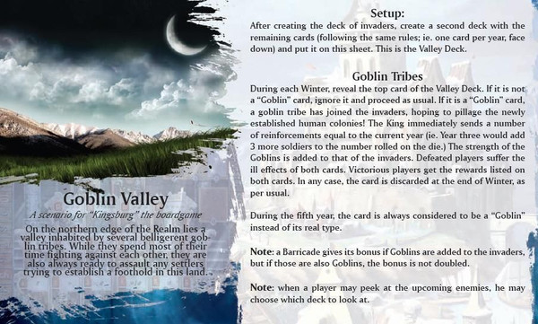 This official scenario for "Kingsburg" creates a second deck of Invaders called the Valley Deck. During each winter, if the top card of the Valley Deck turns out to be a Goblin card, it makes the Invader attack that much more powerful, and hurt even more.