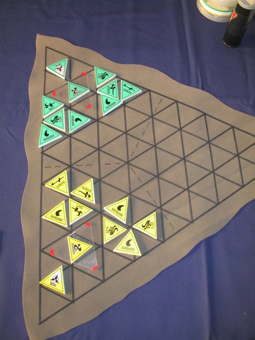 Klin Zha (Klingon chess) is similar to "Earth" chess in that it is an abstract board game between two players. Pieces move and capture opposing pieces like in chess. It is played on a triangular board with triangular spaces. Initial setup is free: players may arrange their pieces in any manner they choose within their section of the board.