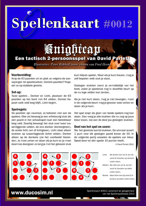 Knightcap is played by two players (light and dark) on an 8x8 chess-like board with 63 horses of the same color. Both player can use every horse as long as that horse can jump to an empty field in a chess-like manner. The piece jumped over is captured.