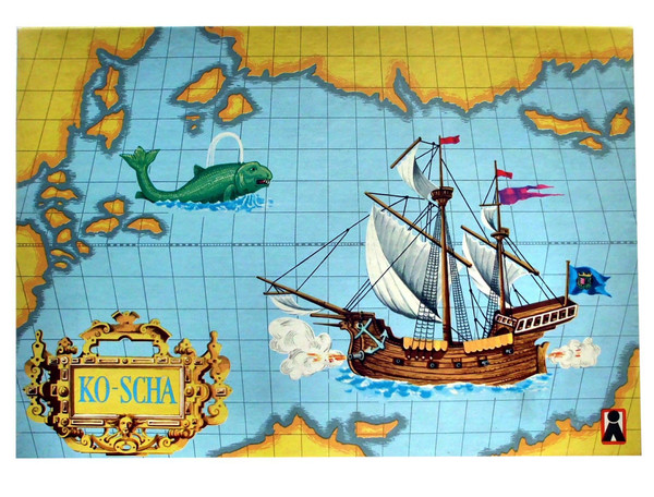 each player moves according die roll; if your ship enters the treasure island you may take a treasure - 1 or 2(max) of totally 13 - and sail home; but there are islands and shoals (light blue squares) which block or complicate (less freight) your way home.