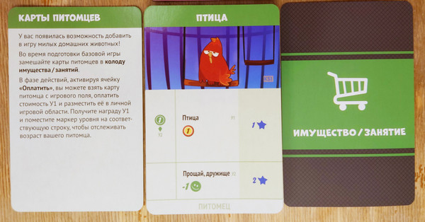 The Pets mini-expansion adds pets to the Item-Activity cards. Pets are different in that you do not have to use card actions to advance them - they do this by themselves during upkeep as long as you feed them (pay the upkeep cost).