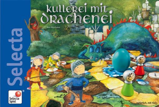 Kullerei mit Drachenei, or "The Roly-Poly Dragon's Egg", is a blend of racing and dexterity. To set up the game, place the twelve treasures on their designated spaces on the game board, place the dragon's egg upright in its nest, place a pawn for each player on the start of the track, and place one dragon egg card "sleeping side" up next to the game board for each player.