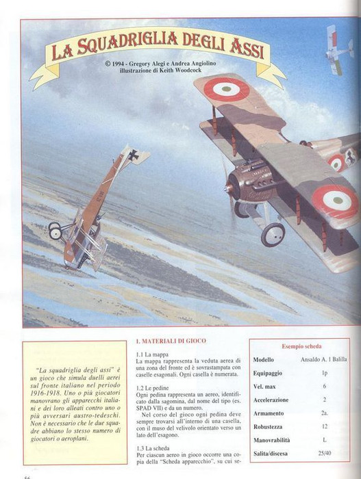 La Squadriglia degli Assi is a Tactical level Aviation-Flight board wargame which depicts all kinds of Air Mission during World War I: from fighting to recon, from bombing to trench strafing and so on. The counters depict every model of airplane that saw operative service on the Italian front between 1915 to 1918, even if in a few exemplars. The map is a full color painting of an aerial view of the front, reconstructed from real recon photos taken on the Italian-Austrian front during World War I, covered by the classic hexagonal grid.