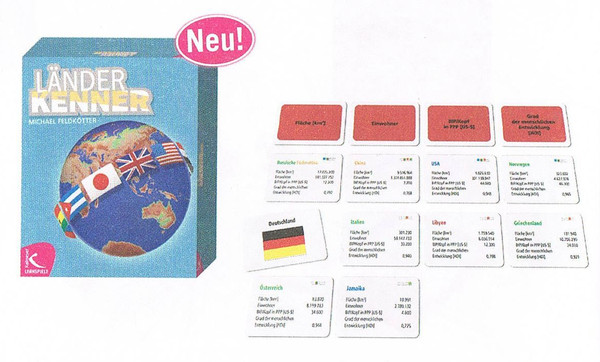 Geography cardgame. There are name of the country and flag in face-up side and information about the different categories in face-down of the card.