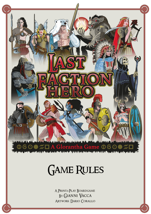 Last Faction Hero is a simple, fast-paced boardgame designed to be played as a ‘filler game’. You know, you have invited your friends over to play RuneQuest or HeroQuest, and one of them is late: “I’ll be there in an hour!”. Last Faction Hero is the perfect solution for the Gloranthan enthusiast with 45 minutes to spare. You are set up in no time and can then start exploring the Lozenge, looking for artefacts and allies to reach your goal or kill all the other heroes. This Print ân Play version has all the game elements needed to play except the dice.