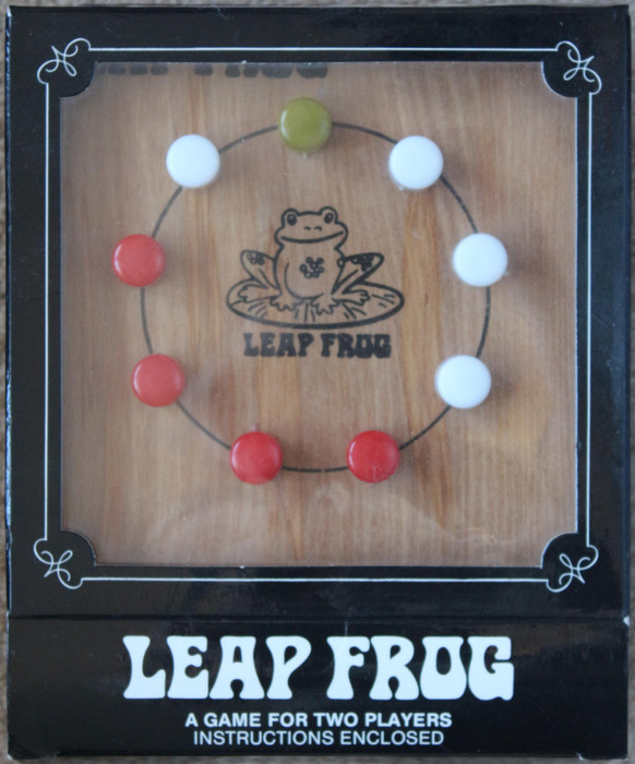 Leap Frog is a game created in New Zealand where opponents pieces are captured by leaping over them. To start each player in turn places one of their four counters in any slot of the nine slots around the circle on the board. Each player in turn then performs a slide move, double jump or jump move, though if the next player can not move, the player who just moved takes another turn. The first player to capture all four of his opponents pieces wins the game.