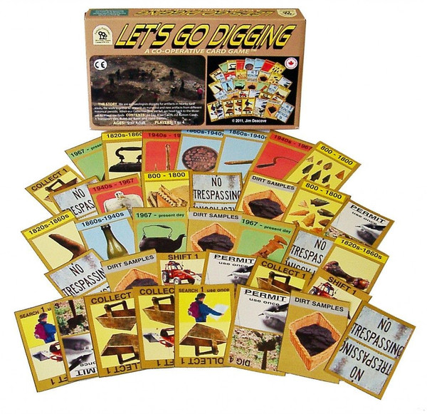 A dig area is formed in the center of the table by creating a tableau of face-down cards in 4 rows of 6 overlapping cards. Only the top card of each row is available for play action. Players are then dealt a hand of action cards that allow them to move cards in the tableau, search the dig field, dig in one column of the field, or transfer cards to the collection site (in a separate area). "No Trespassing" cards will block digging in a particular column and force a player to play a (limited quantity) "Permit" card in order to access any artifacts locked above that card.