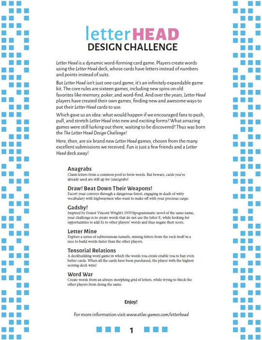 The Letter Head Design Challenge invited Letter Head fans to submit their own games utilizing the innovative Letter Head deck. Here, then, are six brand new Letter Head games, running the gamut from deckbuilding to subterranean exploration. These games expand and change the way Letter Head is played, providing hours of additional enjoyment. And they're free to download from the Atlas Games website—all you need is a Letter Head deck to play.