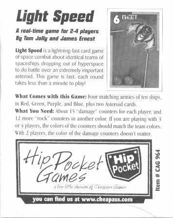 'Light Speed is a lightning-fast card game of space combat about identical teams of spaceships dropping out of hyperspace to do battle over an extremely important asteroid. Each spaceship is equipped with 1 to 4 lasers, and the lasers have 3 different "strengths"