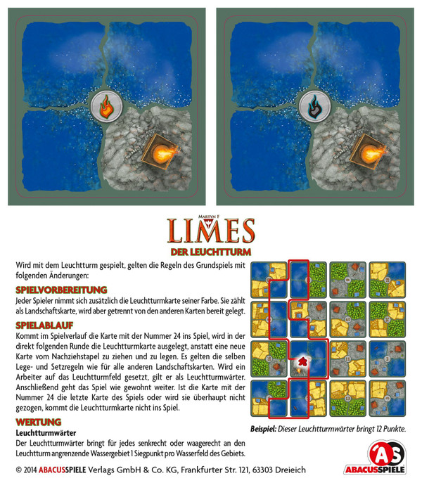 2 cards with Lighthouses. Each player receives the Lighthouse card of his color and places it face-up near his other cards. If card #24 is drawn during the game, the players will have to place the Lighthouse card in the following turn. A worker placed on the lighthouse is a lighthouse keeper and will score 1 victory point for each water zone of any water territory adjacent to the lighthouse.