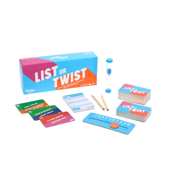 You'll need to think quickly in List or Twist, the category-guessing game from Ridley's Games where the answers are only as easy as the clues! In this fast-paced game, players split into two teams and take it in turns to try to guess what's listed on the card by the clues made up by a player on their team. They then switch things up and play off against each other, with things coming to a head during a bonus round! Each time a clue is offered, the team can either List by requesting another clue, or Twist by guessing the answer! But don't ask for too many clues or guess incorrectly, as each time you do you lose points!