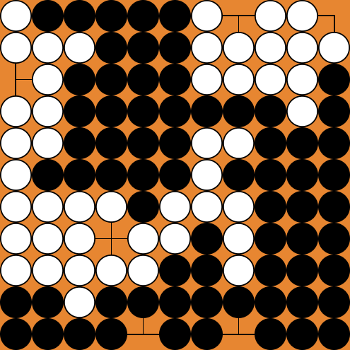 Author's notesA very interesting, non-obvious feature of Loose is that, assuming that players will only pass their turn when there are no more useful moves available, the game will never end in a tie. In Go, ties can occur if there is an odd number of empty points in seki, but seki patterns in Loose always involve an even number of them. The tie-break rule is just included to make the game theoretically drawless, rather than just in practice.