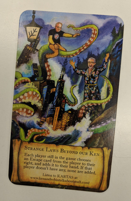 If you buy Lost in R'lyeh at your friendly local game store and send in a selfie of you at check-out, Atlas Games will mail you a free promo card featuring Ken Hite and Robin Laws — of award-winning podcast Ken and Robin Talk About Stuff — called "Strange Laws Beyond Our Ken."
