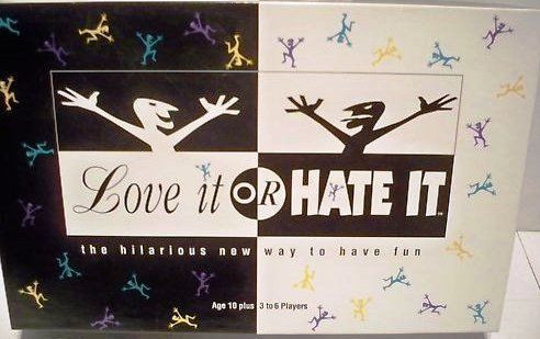 Party game where a category is chosen (random spin on any one of four disks). Then all players write down something associated with that category and whether they love or hate it. All slips of paper are put together with the authors unknown. Then the reader goes through the slips of paper and everyone votes (with color cards and either their "love it" or "hate it" card) on who they think wrote the particular slip of paper.