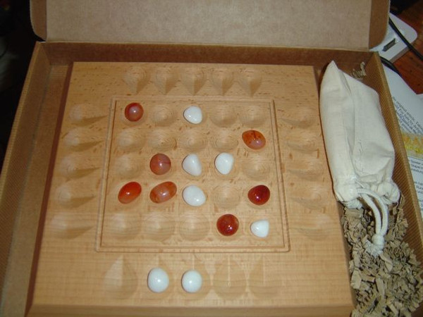 Two sets of 12 stones each are placed in a 5x5 square grid. The first two rows in front of a player, plus the two rightmost pits on the third row contain that player's stones. On his turn, a player must displace one of his stones, performing one of the following legal moves: 1) a stone can be moved orthogonally to an adjacent free field, 2) a stone may jump in a straight line over at least one same-coloured stone, and onto the next free field, 3)a stone can jump over at least one same-coloured stone and into a pit occupied by an opponent's stone which is then captured and removed from the game.