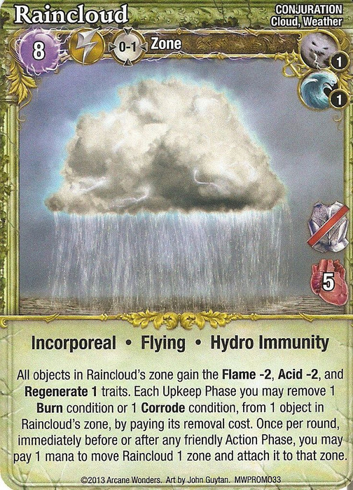 All objects in Raincloud´s zone gains the Flame -2, Acid -2 and regenerate 1 traits. Each Upkeep phase you may remove 1 Burn condition or 1 Corrode condition, from 1 object in Raincloud´s zone, by paying its removal cost. Once per round, immediatly before or after any friendly Action Phase, you may pay 1 mana to move Raincloud 1 zone and attach it to taht zone.