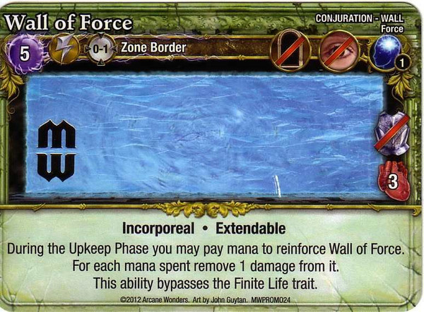 During the Upkeep Phase you may pay mana to reinforce Wall of Force. For each mana spent remove 1 damage from it. This ability bypasses the Finite Life trait.