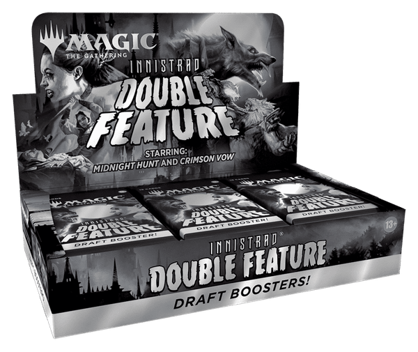 Each booster pack of Innistrad: Double Feature contains 7 cards Midnight Hunt and 7 cards from Crimson Vow (4 commons, 2 uncommons, and 1 rare each), plus 1 card from either of the two sets in an all-new "Silver Screen" foil treatment that resembles the traditional foils seen in other sets, except that the sheen on them is silver instead of rainbow.