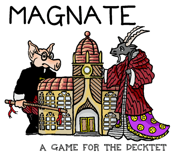 Magnate is a resource management game for the Decktet. Players vie to add more value to their own side of five district cards by building cards of higher total rank per district than their opponent. Cards are built using suit-based resource tokens, which are earned from already-built cards on every turn based on a roll of the dice, CATAN-style, or by selling unwanted cards. Taxes are occasionally imposed on the wealthy. The player with the most per-district victories wins.