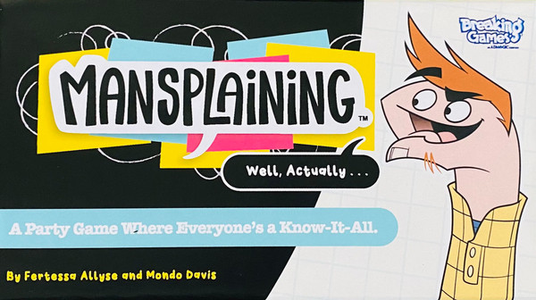This party game gives each player a chance to mansplain a random topic to a captive audience. The mansplainer for the round draws a topic card and four detail cards with random words. They then have 60 seconds to explain their topic — starting with the words, "Well, actually..." — while slipping in as many detail words as they can. They cannot use the words on their topic card during this explanation! When they finish, players write down their guesses for the mansplainer's topic and detail words, scoring 1 point for each correct guess. The mansplainer scores for each detail included in their explanation and if at least one but not all of the audience guesses the topic.